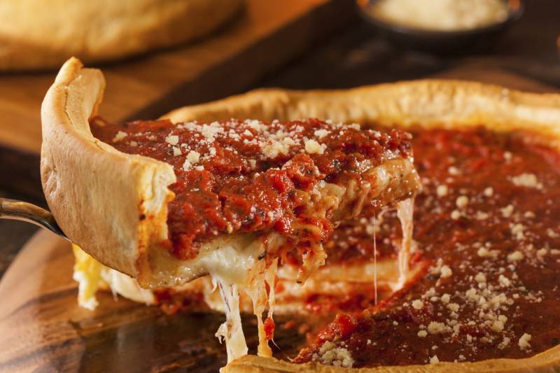 Los inmigrantes italianos en Chicago, son los responsables de este popular tipo de pizza. La pizza estilo Chicago tiene una masa gruesa y se hornea dentro de un plato metálico. Sus bordes son altos y el fondo está tostado para que soporte el delicioso relleno de tomate y del queso mozzarella. Sus ingredientes: salsa de tomate, mozzarella, pepperoni y el sausage (un tipo de salchicha).