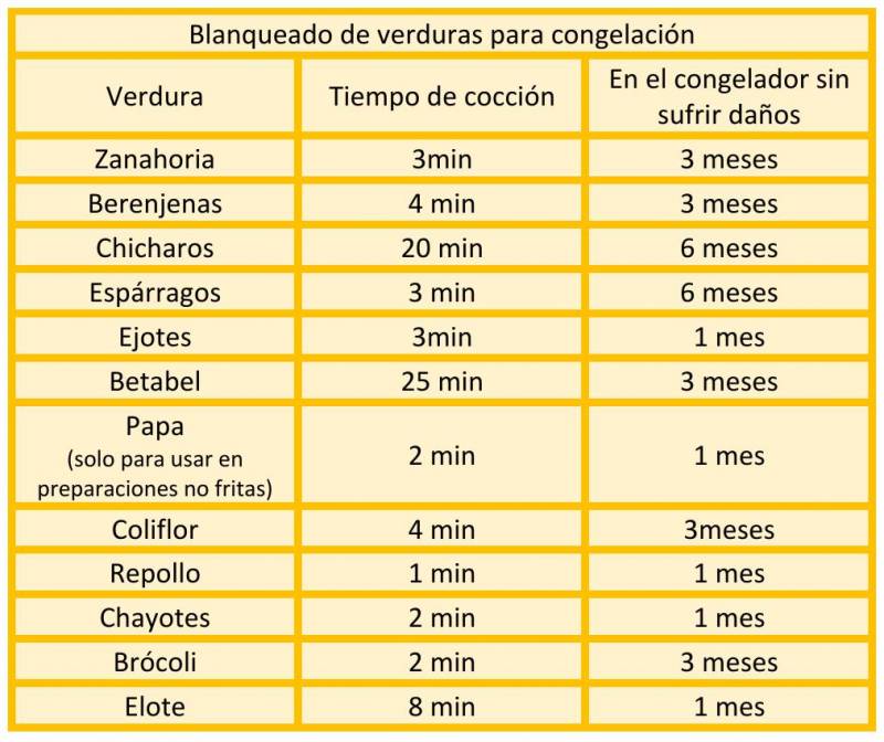 Coloca la verdura en cubos dentro de la olla con agua hirviendo por el tiempo indicado en la tabla.